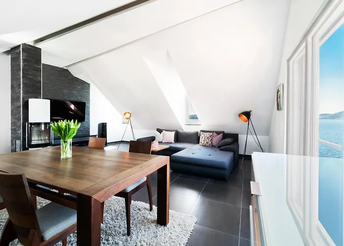 Ferienwohnung Riviera Self Check-In Uberlingen med 1 sovrum, som ligger inom 5 minuter till fots från Seepromenade, erbjuder snabb tillgång till olika turistattraktioner i närheten. Den 70 m² stora lägenheten har också en terrass med utsikt över bergen.